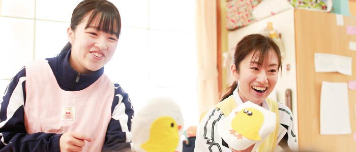 学内で講義・実技の授業で保育の基礎を学ぶ